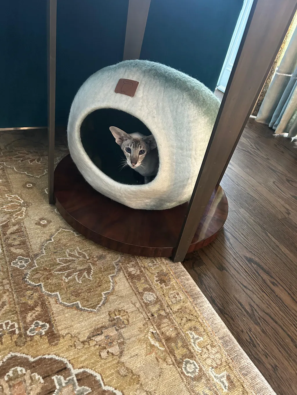 My new cat cave is both cozy and inviting for my two kitties and beautiful to look at. You can tell it was made with love and intention . It is well balanced and doesn’t topple over when the kitties jump in. Thank you!